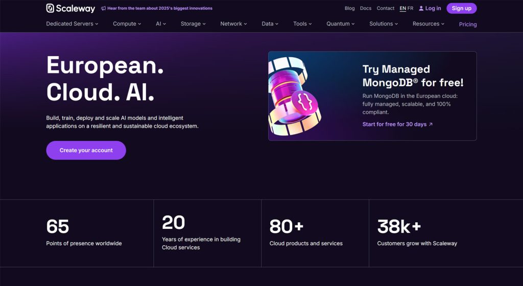 Scaleway est spécialisée dans les ressources de calcul basées sur le GPU pour l'entraînement et l'inférence de l'IA. Elle cible les startups et les équipes de recherche qui ont besoin d'un matériel de haute performance sans la complexité des grands hyperscalers.