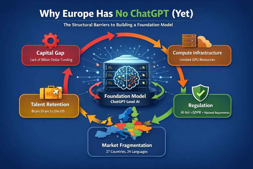 Europe is unlikely to produce its own ChatGPT in the short term. The reasons are structural: capital, infrastructure, talent retention, and market fragmentation interact and cannot be solved in isolation. European initiatives such as Mistral or Aleph Alpha demonstrate that building proprietary foundation models is possible — but with different priorities and market positioning than ChatGPT.